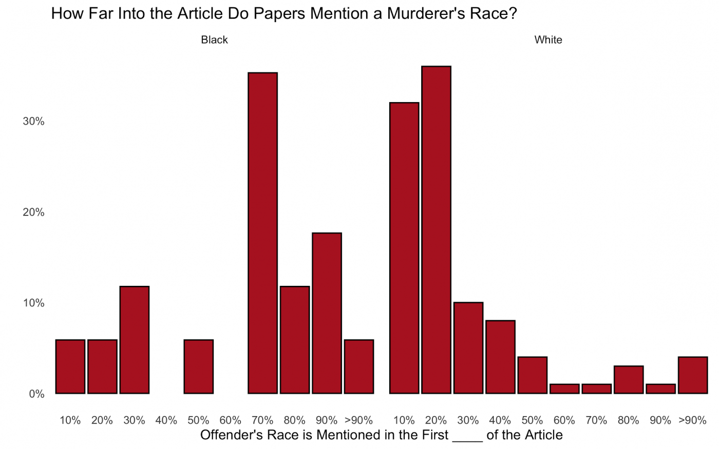 The Free Beacon collected data on nearly 1,100 articles about homicides from six major papers, all written between 2019 and 2021. Those papers included the Chicago Tribune, Los Angeles Times, New York Times, Philadelphia Inquirer, San Francisco Chronicle, and Minneapolis’s Star-Tribune—representatives of each paper did not return requests for comment for this article. For each article, we collected the offender’s and victim’s name and race, and noted where in the article the offender’s race was mentioned, if at all.”