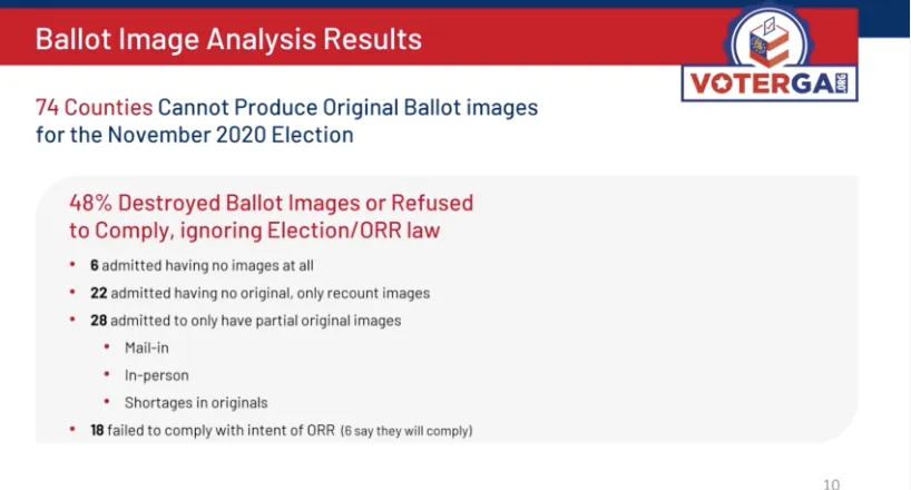 2) Let’s discuss the scale of the 2020 election fraud. There are 159 counties in Georgia. VoterGA made open records requests from all of them, and found that 74 counties cannot even produce the complete ballot images — as required by law. That’s nearly half of Georgia’s counties that are running illegal elections.