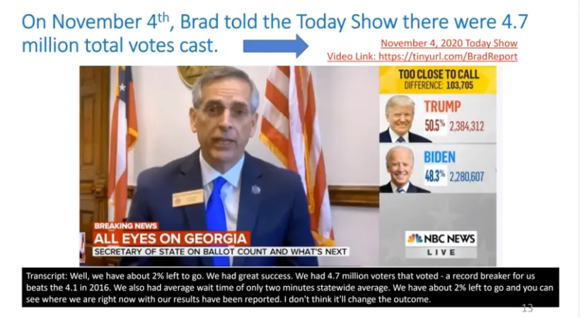 3) Georgia’s SOS Brad Raffensperger appeared on TV on November 4th, 2020 to tell the world that Georgia had 4.7 million total votes to count.