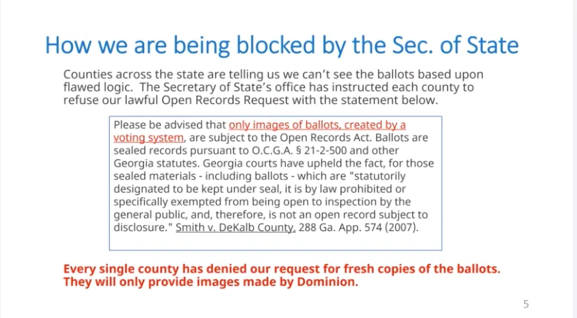 1) VoterGA is being blocked from reviewing Georgia’s original ballots because every county in Georgia has been told to deny VoterGA’s open records requests by the Secretary of State Brad Raffensperger.