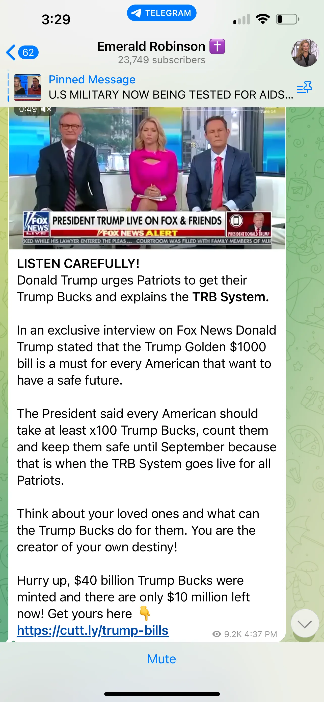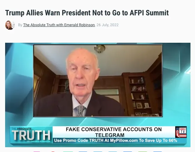 Gen. McInerney’s theory is that these fake social media accounts run by impostors are an attempt to discredit us. My lawyers have reached out to Telegram — without success. Meanwhile, the fake Emerald Robinson account operators are running ads for something called “Trump bucks” while using my name and face.