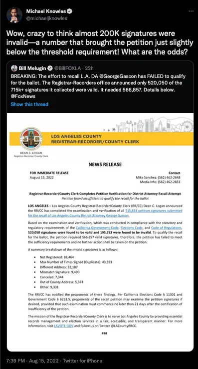 It’s no big deal, for instance, to throw out 200,000 signatures out of 715,000 collected for a recall of District Attorney George Gascon in Los Angeles. That’s a huge story in any year before this year but it’s a footnote in the Banana Republic of Biden. Democrats did that yesterday — and you probably didn’t even hear about it.