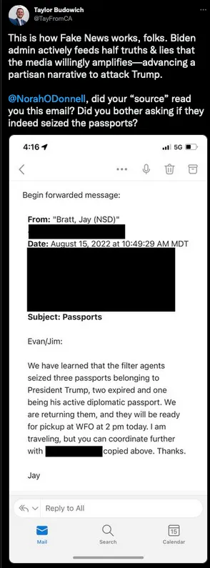 Except, of course, Trump was right. The FBI had stolen his passports during the raid on Mar-a-Lago. Trump’s attorneys even released an email from the FBI telling them when his passports could be picked up! To make matters worse: the passports were missing on the FBI’s property receipt of items seized (whoops), and the warrant didn’t allow the FBI to take them anyway (whoops again), and the federal government had failed to get a special court order to seize his passports too (triple whoops).