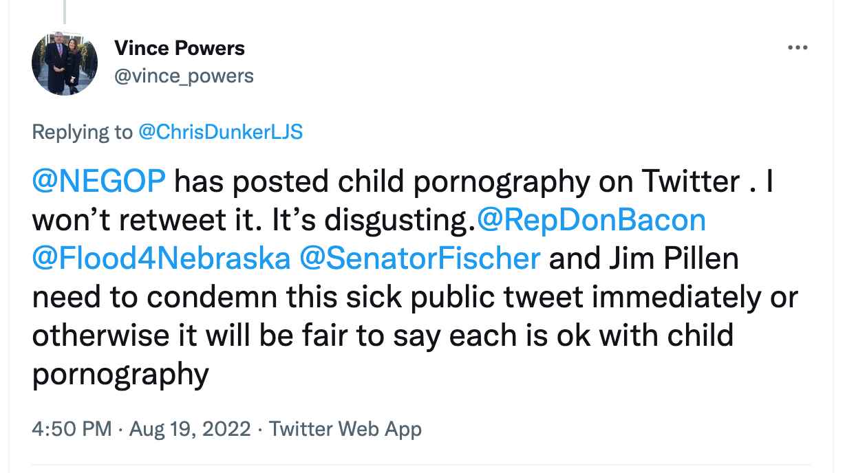 The post was quickly pulled down, and the Republican chair said it had not been authorized, but of course, this is the internet, and several screen grabs were taken before it disappeared. That’s when the former chair of the Nebraska Democratic party accused them of peddling child pornography and called them disgusting.