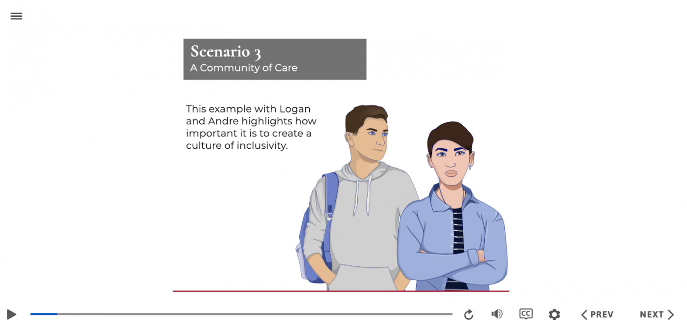 Every scenario in the training involves at least one character who is transgender, nonbinary, or disabled, regardless of the underlying lesson. In one scenario about stalking, both the victim “Adrian” and perpetrator “Toni” use “they/them” pronouns; in another scenario, one of the students uses a wheelchair—even though the subject has nothing to do with disability.
