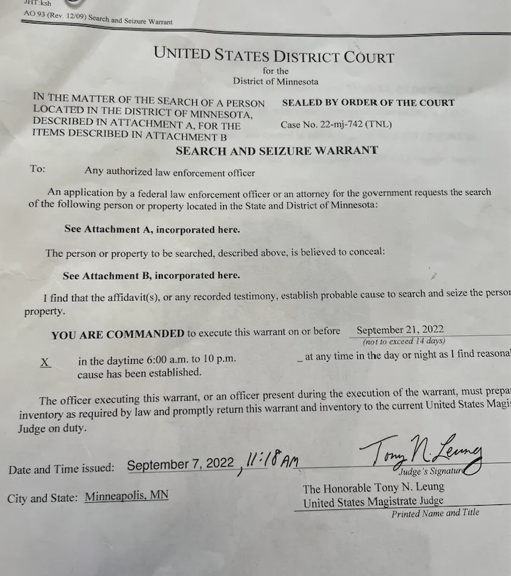 Judge Tony Leung signed this warrant at 11:18 am on September 7th in Minnesota. His bio is here.
