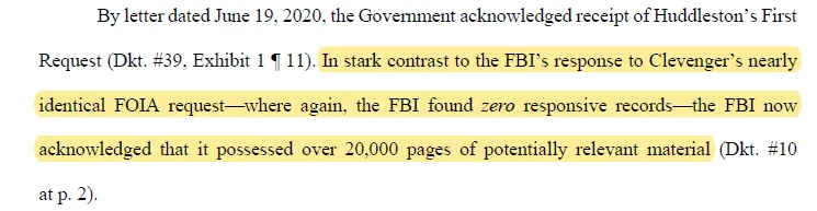 This fight dates back to 2017 and includes two FOIA lawsuit. In the first lawsuit, the FBI produced no responsive documents. The parties knew the FBI had something, and so this sparked a second lawsuit – where the FBI somehow found 20,000 pages of potentially responsive documents. The court explains: