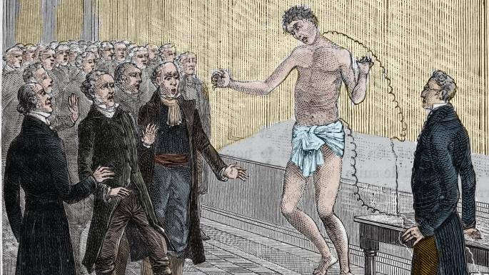 Incisions were made at the neck, hip, and heels, exposing different nerves. Ure stood over the body, holding two metallic rods, charged by a 270 plate voltaic battery. Those rods, when placed to the different nerves, caused the body to convulse and writhe. When the rods were touched to Clydesdale’s diaphragm, his chest heaved then fell. “When the one rod was applied to the slight incision in the tip of the forefinger,” Ure later described to the Glasgow Literary Society, “the fist being previously clenched, that finger extended instantly; and from the convulsive agitation of the arm, he seemed to point to the different spectators, some of whom thought he had come to life.”