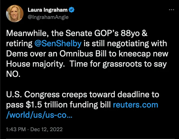 A GOP senator was willing to state publicly — on Fox News no less! — that his own party has become a joke. That was Thursday. Two days earlier, Kevin McCarthy had taken the extraordinary step of appearing on a prime-time Fox News show to openly criticize Mitch McConnell and GOP Senate leadership for trying to pass the omnibus bill with Democrats. Fox News host Laura Ingraham even took to Twitter to open fire on McConnell’s chief budget negotiator Richard Shelby.