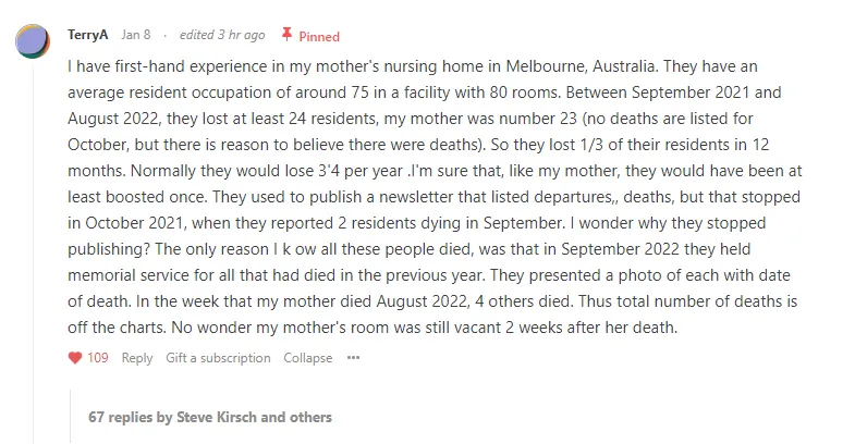 EXCERPT: “After I posted a story of a large geriatric practice which experienced a 3X increase in all-cause mortality post-vaccine (all of the excess deaths were attributed to the vaccine), I received an even more extraordinary story of a nursing home in Australia where the death rate post-vaccine skyrocketed by 6X after the vaccines rolled out (from 3 to 4 per year to at least 24 over a 12 month period) which killed 33% of the residents of the facility: