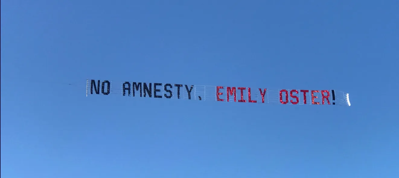 EXCERPT: “Many of you may remember Emily Oster’s disingenuous plea for amnesty in The Atlantic. The responses to it were almost all “How about [insert your preferred profanity].” My favorite response was someone choosing to pay to fly this over her house after the article came out: