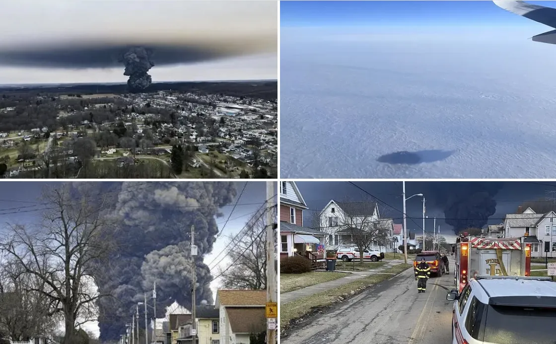 EXCERPT: “Major media cover-up in Ohio! The 50+ car derailment caused a huge amount of toxic chemicals to leak. The authorities began burning the chemicals to avoid an explosion. Now megatoxins are Chernobyling Ohio…