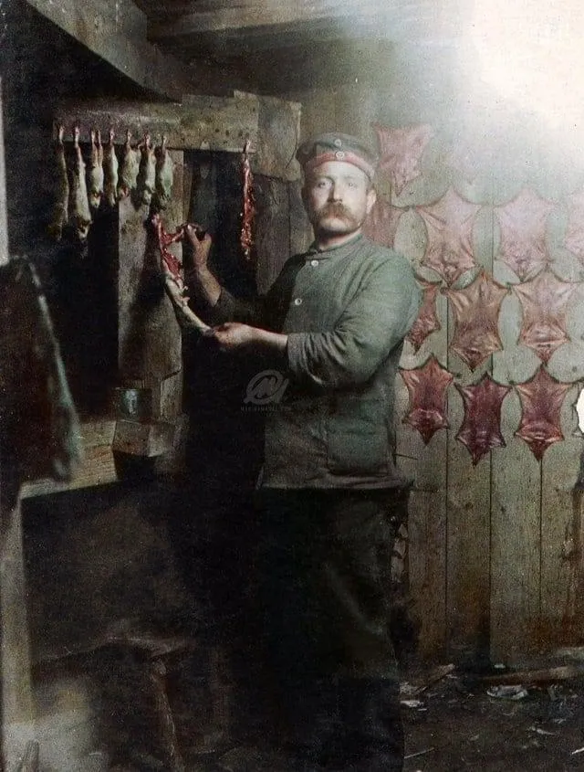 “German Soldier tanning rat skins in a trench in WWI to use as patches to repair uniforms…”