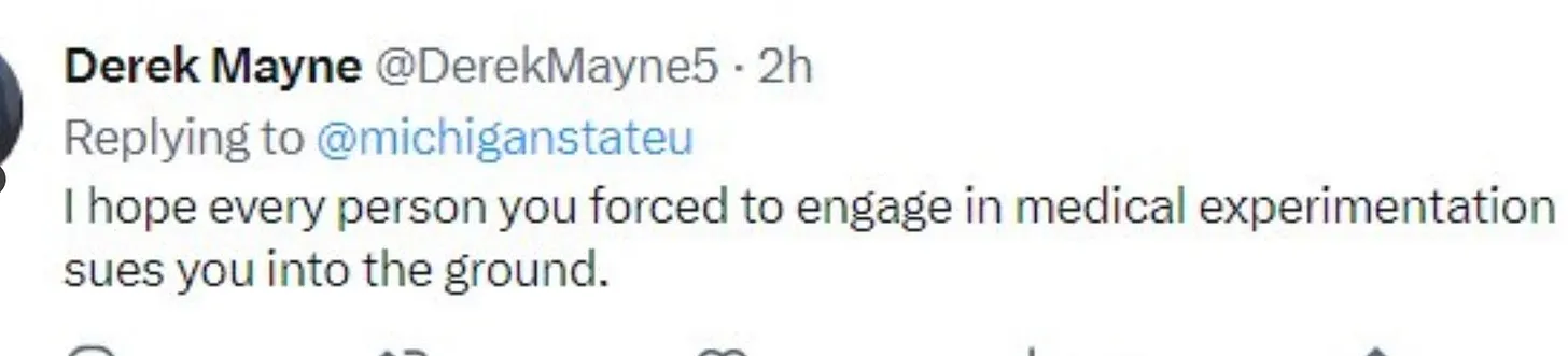 Fair warning to any institution of “higher learning” that insists on sticking with the Narrative of what amounts to government assisted “all in this together” genocide with products that are lethally defective at best, and deliberate herd-culling bioweapons at worst.