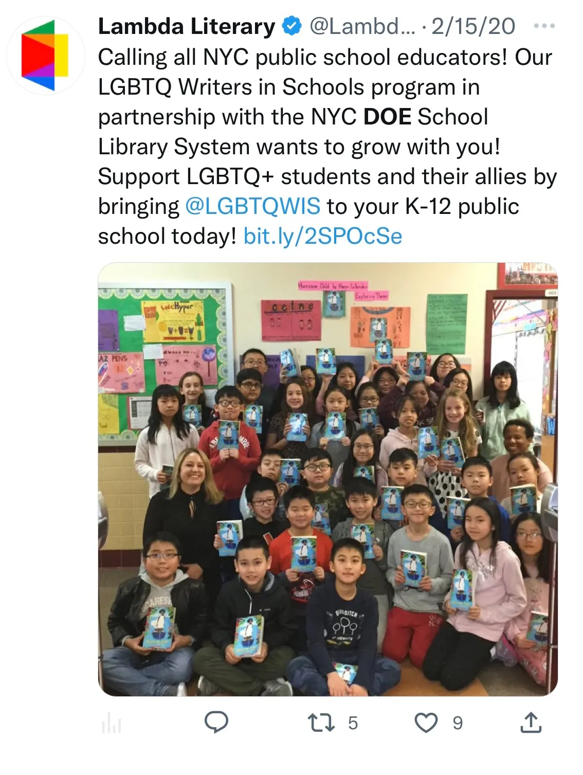 In 2015, the NYC Department of Education partnered with Lambda Literary, an LGBTQ literary organization, to implement their LGBTQ Writers in School program in the NYC public school system. The program arranges for LGBTQ writers to visit K-12 classrooms to discuss LGBTQ literature and provide “safe spaces for students to talk about great books, queer life, and how to thrive as an LGBTQ person.” Books are chosen by the teachers from a suggested book list, and the students are required to read the books prior to the visit.