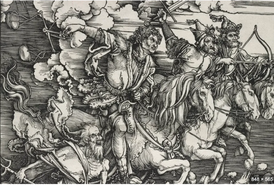 Most vivid and frightening is his vision of Four Horsemen who are unleashed on the earth. The first is mounted on a white horse, armed with a bow, and adorned with a crown. He apparently represents Pestilence. The second is mounted on a red horse and armed with a sword. He is thought to represent Civil War. The third, who apparently represents Famine, rides a black horse and carries a scale. Upon the fourth horse is mounted a pale and gaunt figure who represents Death.