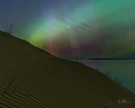 “Aurora dunes over sand dunes… For a few hours during last month’s severe geomagnetic storm, the sky mirrored the Earth. On March 23rd, Ethan Hohnke of Empire, Michigan, photographed aurora dunes over the Sleeping Bear Dunes in Michigan’s lower peninsula:”