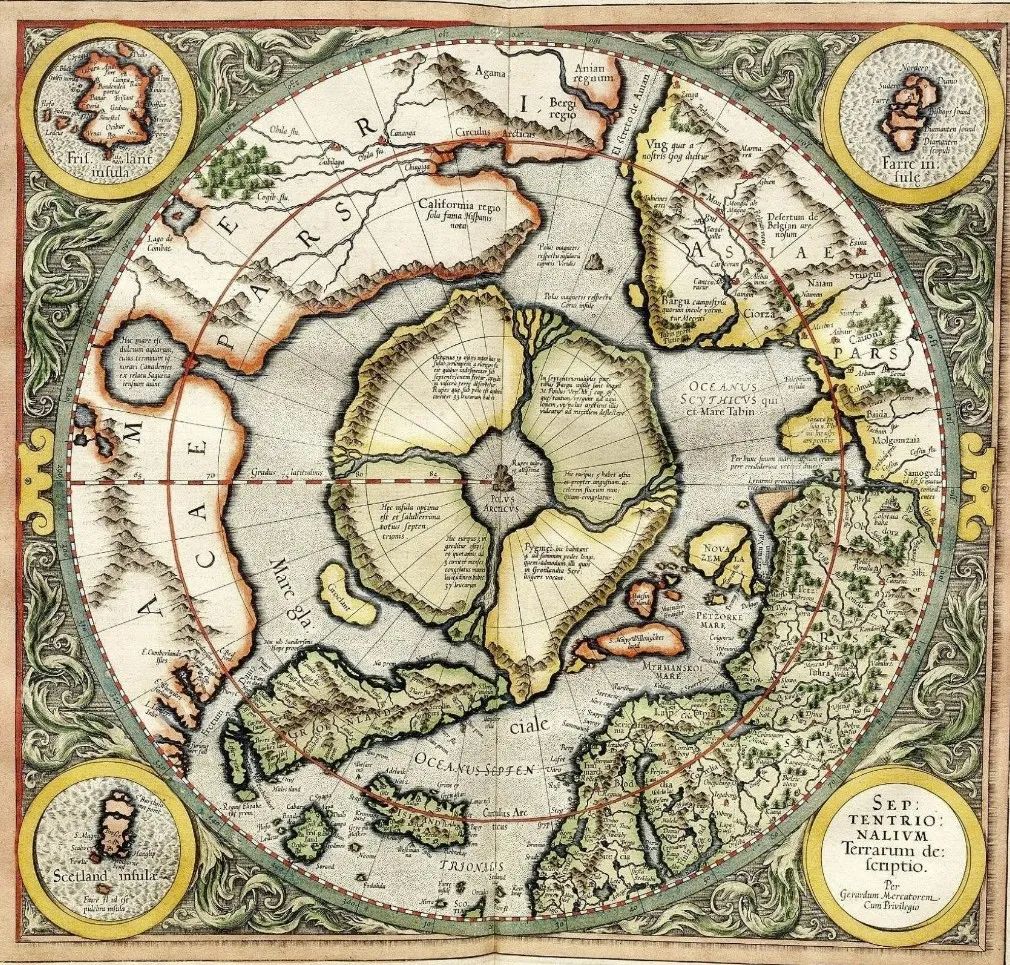 “Mercator’s early arctic map depicts Mt Meru, the magnetic mountain at North Pole…”