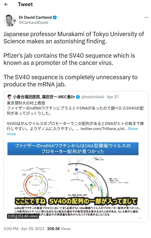 EXCERPT: “April 14, 2023: Recent experts have come forward confirming that plasmid DNA is in Pfizer’s mRNA vials and that plasmid DNA is for purposes of the expression on non-human DNA inside humans through cell transfection.
