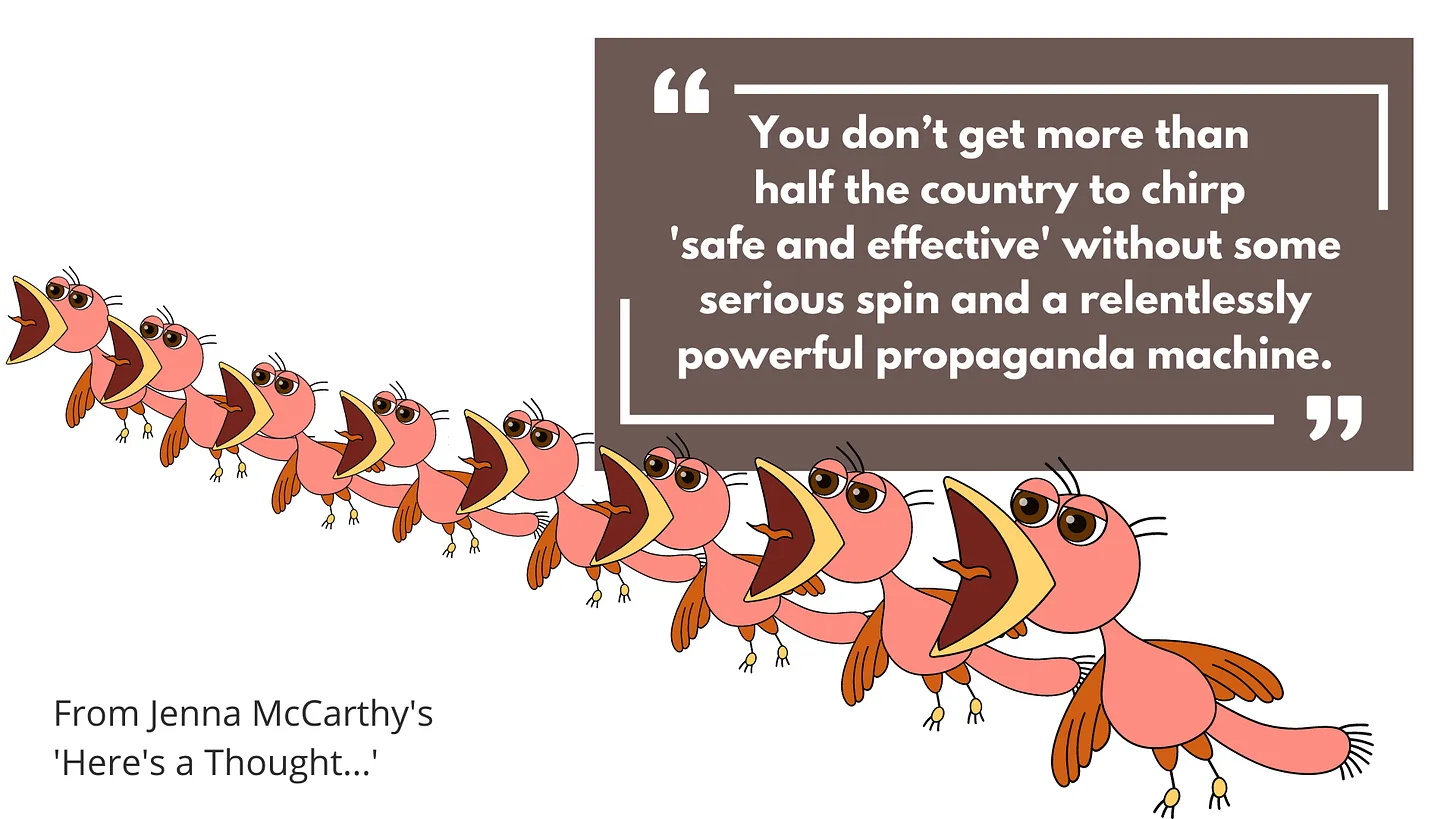 As hard as they try — and damn, do they try; Pfizer and J&J spent more than $50 million on COVID advertising in the first six months of 2021 alone — the pharmedia (my word) and their favorite philanthropaths (not my word) will never scare me into begging for something I don’t need that could injure or kill me.”