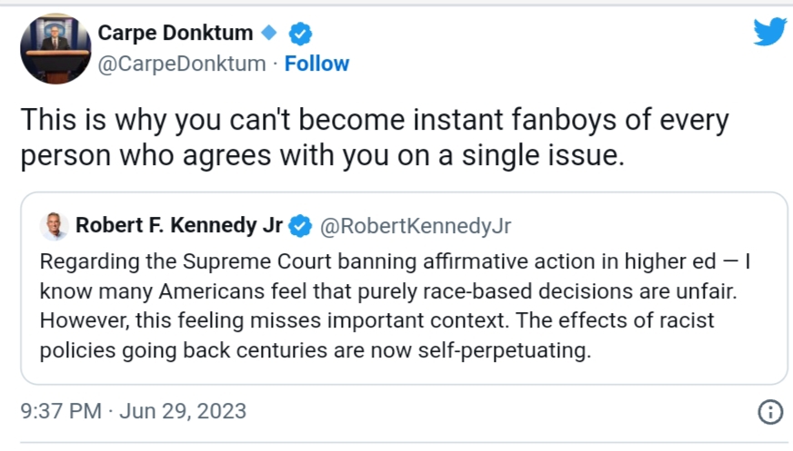 Sorry RFKjr. I don’t nor will I ever share your “white guilt.” You grew up strangely privileged (your father’s wealth & influence were largely derived from his time as a bootlegger. Your family paid an enormous price for that prestige.)