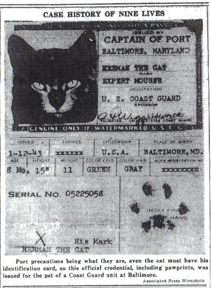 “Pet of a coast guard unit that sailed on ships until the mid-20th century to catch rodents had an identification card signed with their paw prints…”