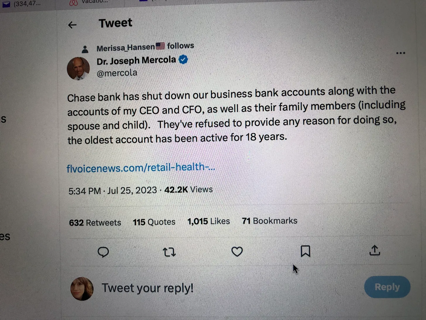 On July 13, Mercola Market, along with the CEO, CFO and some of their family members, all received similar letters from Chase Bank saying “[they] have decided to close” their individual personal and business accounts.”