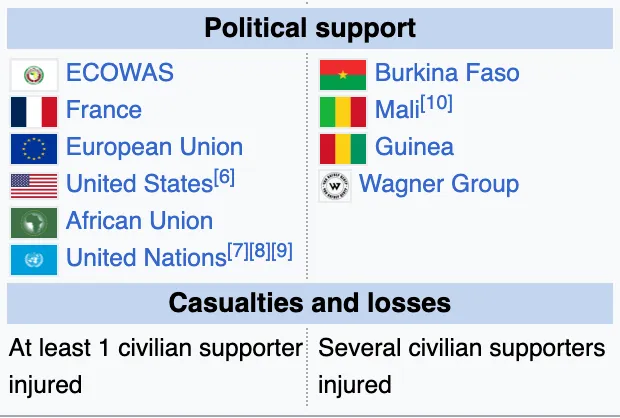 When looking into the Niger Coup, even the Wikipedia page makes some humorous determinations that tell us more at first blush than usual. Backing the deposed government? The European Union and the United Nations, as well as the Deep State Department. Backing the coup? Russia and the Wagner Group. Oh … and look at those very serious body counts thus far.” — Burning Bright