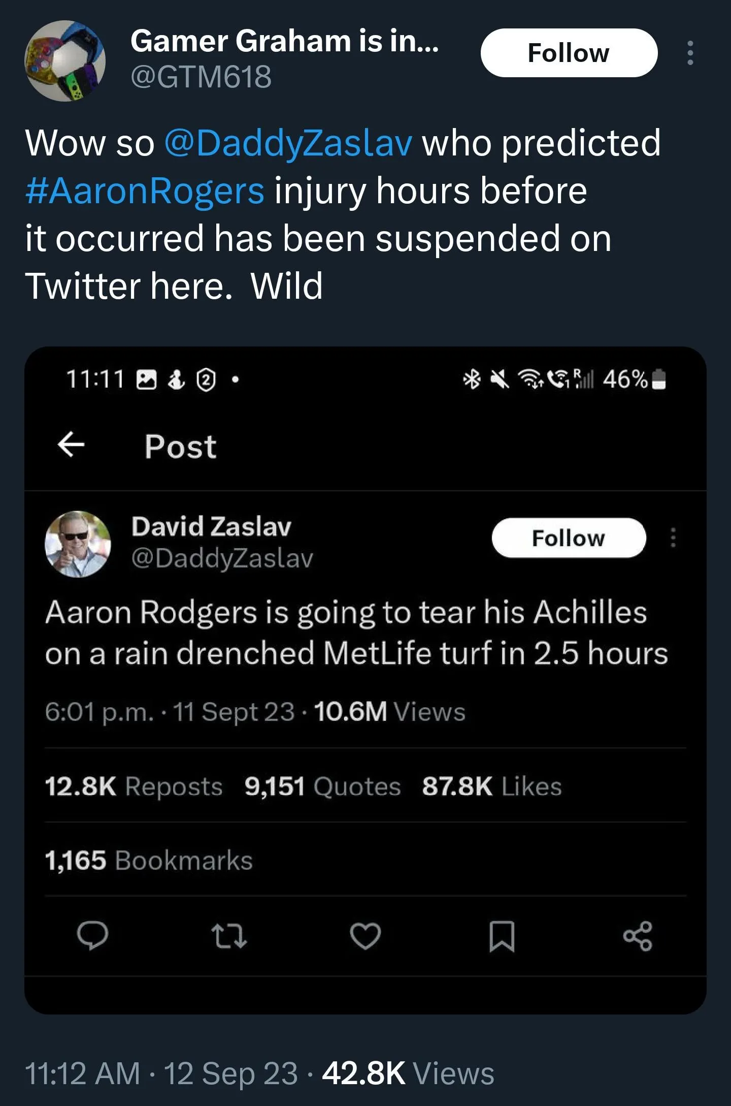 Well, at least the Jets won in OT – yep, Rodgers out for the year, and who knows about his career. I’m watching Jesse from last night – oh, FFS! Kapernick’s agent reached out to Jets’ owner!!! Jesse says not happening, nor is Brady coming out of retirement. I’m going over the 5 links I normally try to restrict myself to….