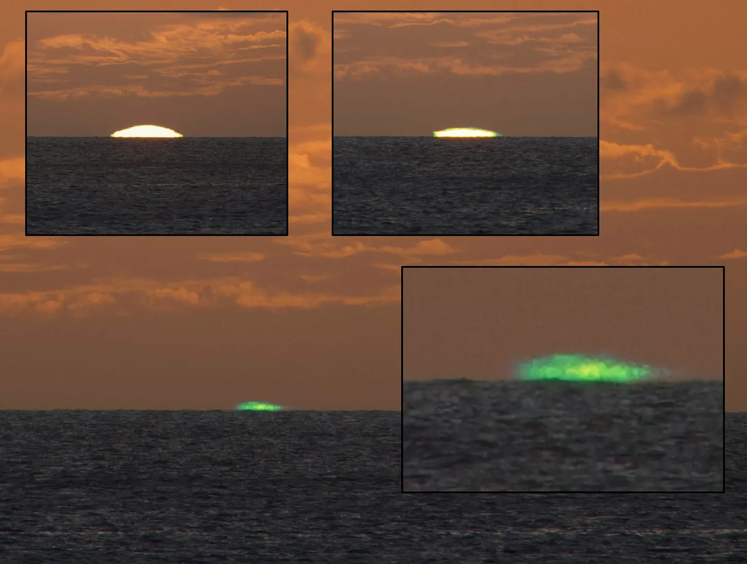 “Green “flash” at sunset, captured in Bonaire, Dutch Caribbean… A slightly rare atmospheric phenomenon…”