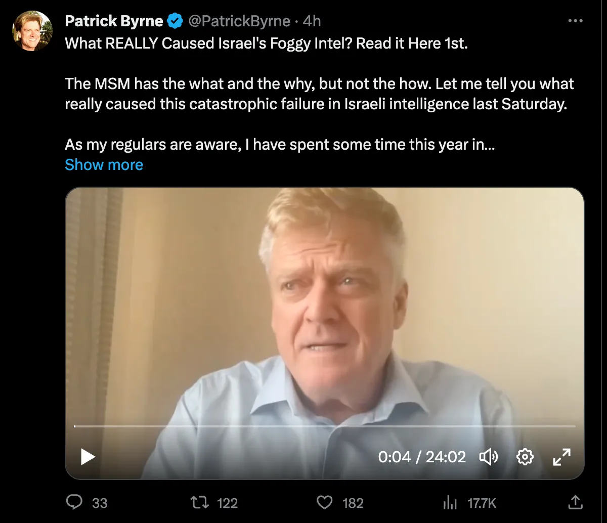Well, not everyone — Patrick Byrne, at least, was one of the few people willing to discuss uncomfortable truths and inconvenient facts today. In a short video released on Twitter/X, Byrne told his followers that “the real blame for this intelligence catastrophe should be placed with the machinations of the Biden Regime, and in particular, SoS Anthony Blinken, DNI Avril Haines, and Dan Shapiro.”