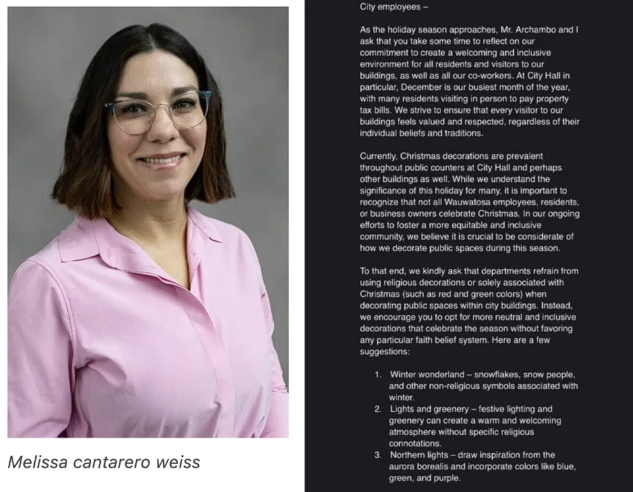 “Melissa Cantarero Weiss, the Deputy City Administrator of the City of Wauwatosa, WI, sent an email to city workers instructing them not to use red and green and religious Christmas decorations because it’s not “inclusive” and “equitable.” She also refers to snowmen as “snow people” because snowmen is gendered language.”