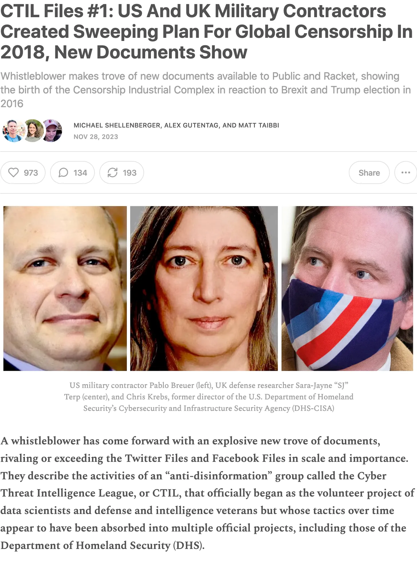 ENTIRE ARTICLE: “Liberal journalists Matt Taibbi and Michael Shellenberger have recently released new allegations from a whistleblower regarding the origins of the censorship-industrial complex in a story they’re calling the CTIL Files. As the journalist Glenn Greenwald has publicly stated: this new story is certainly the biggest online censorship story since the Twitter Files.