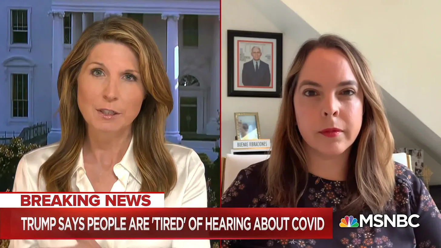 In September 2020, Troye was fired by the Trump Administration after someone finally figured out that she was essentially a double agent inside the White House on VP Pence’s staff. Within weeks of that firing, Troye had publicly launched an anti-GOP organization and was doing media appearances to support the Biden 2020 campaign — often with a framed portrait of Dr. Tony Fauci visible on her office wall.