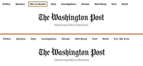 “It’s over” – comments investigative journalist Kit Klarenberg after noticing that The Washington Post quietly deleted a prominent tab from its Masthead. What was a long featured “War in Ukraine” tab, which had been there from the start of the war going back to Feb. 2022 has disappeared…