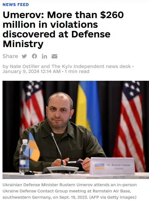“Internal audits and investigations at Ukraine’s Defense Ministry over the past four months have uncovered more than Hr 10 billion ($260 million) in violations committed previously, Defense Minister Rustem Umerov announced on Jan. 8. Two major corruption scandals preceded the ousting of previous Defense Minister Oleksii Reznikov, one regarding inflated prices for food supplies and the other connected to low-quality winter jackets…I think this is only the tip of the iceberg…”