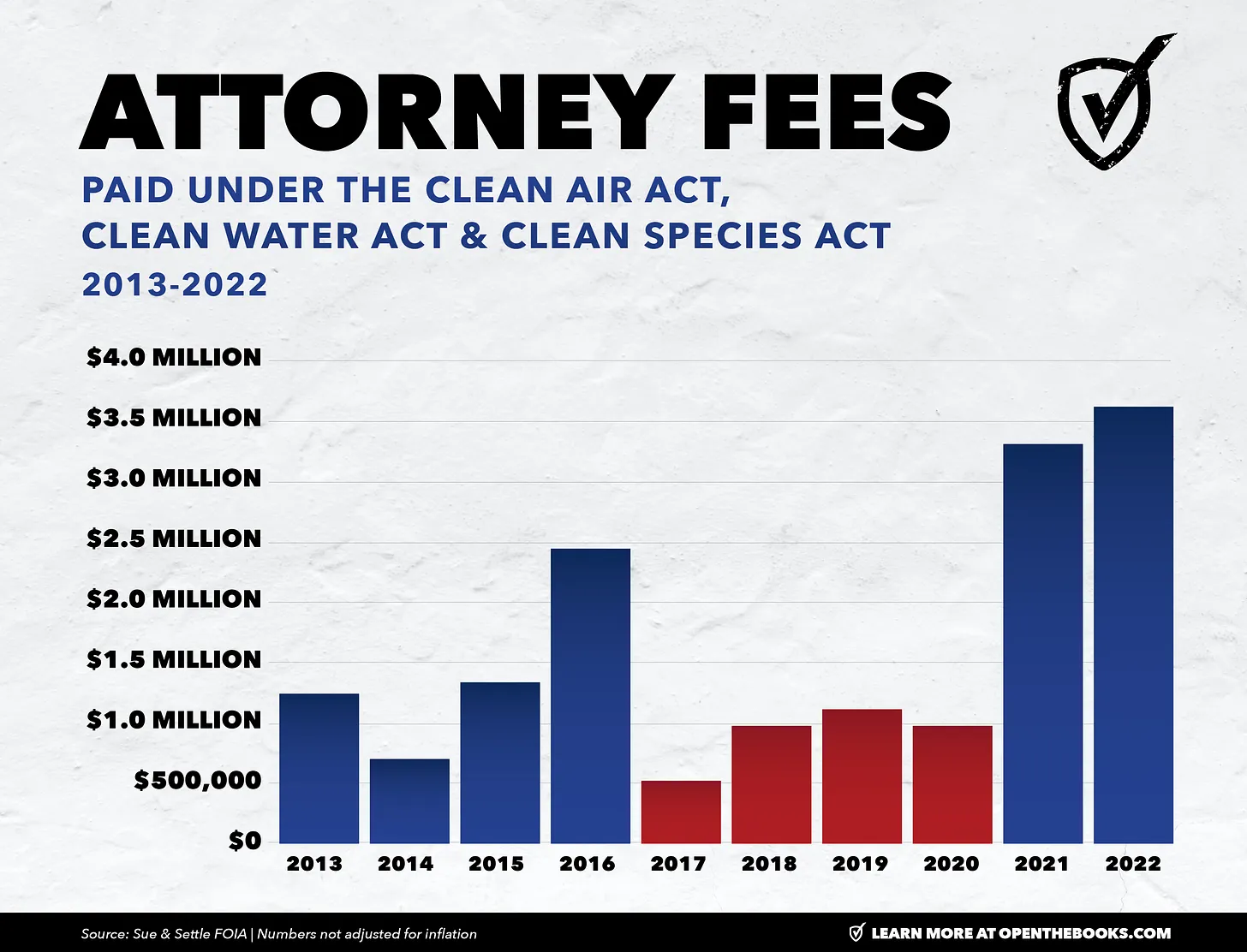 (Attorneys’ fees paid to litigants under the Clean Air Act, Clean Water Act, and Endangered Species Act from 2013-2022. Figures not adjusted for inflation.)