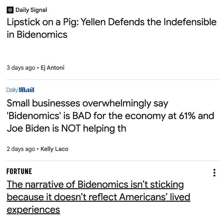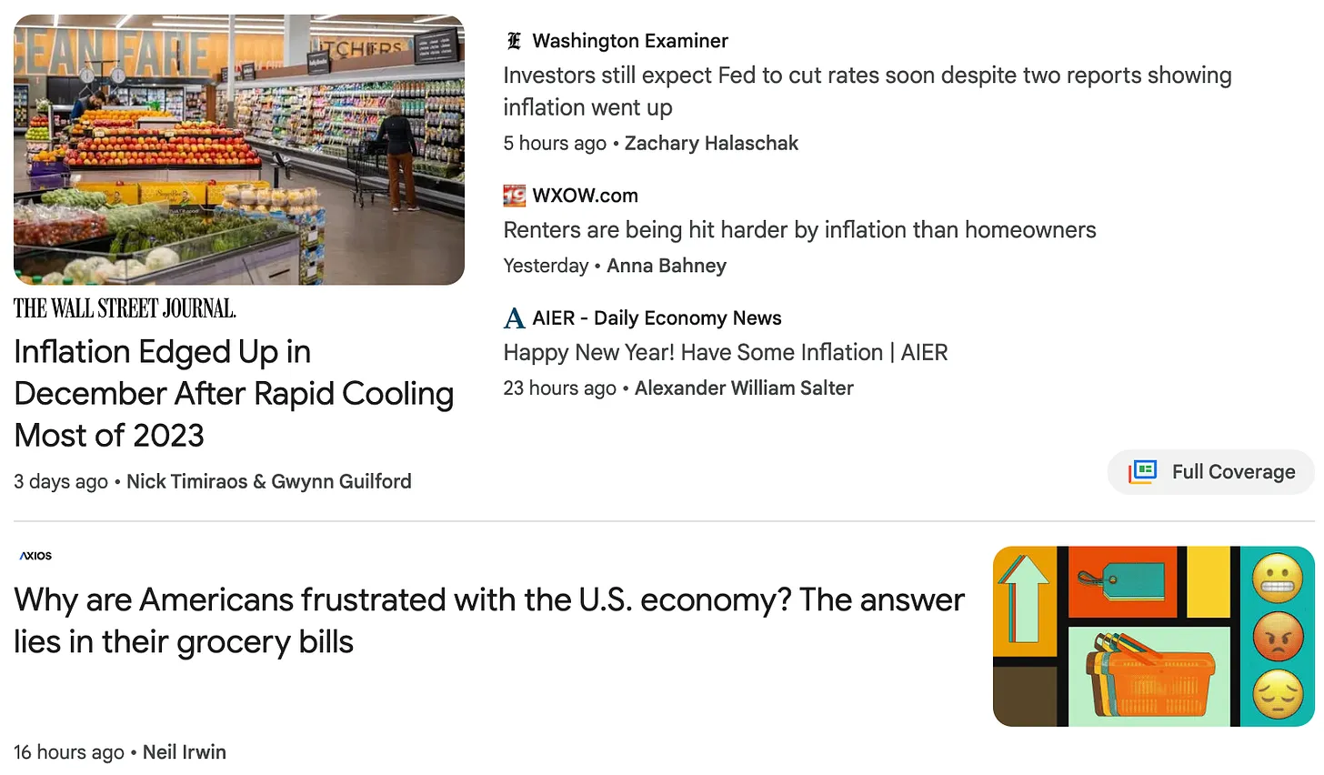Today’s search on “inflation” on the Googleweb News (see below) reveals that Bidenomics isn’t done with us yet. Looks like the 2024 economy is going to be another rocky year on the 99% of us who aren’t independently wealthy.