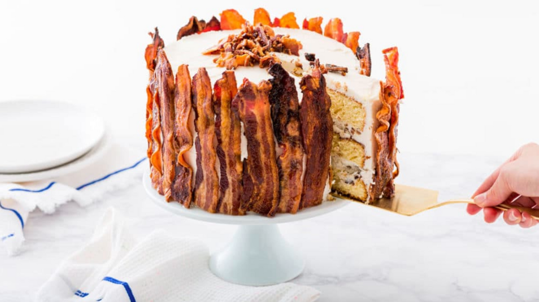 Frost the top of one cake layer and sprinkle some bacon bits on top. Stack another cake layer on top and frost and sprinkle bacon. Stack the third cake layer on top. Frost the top and sides of the cake.