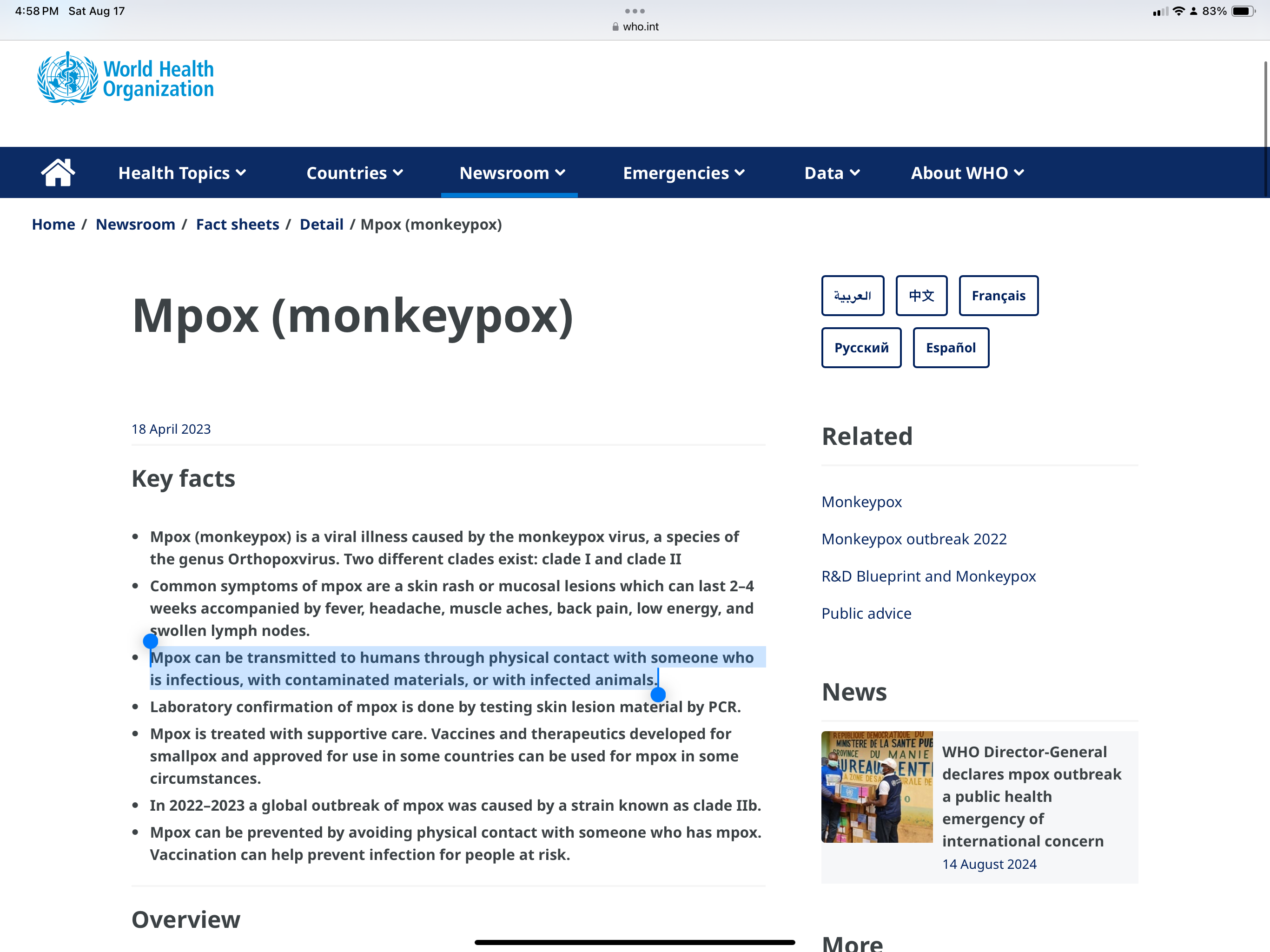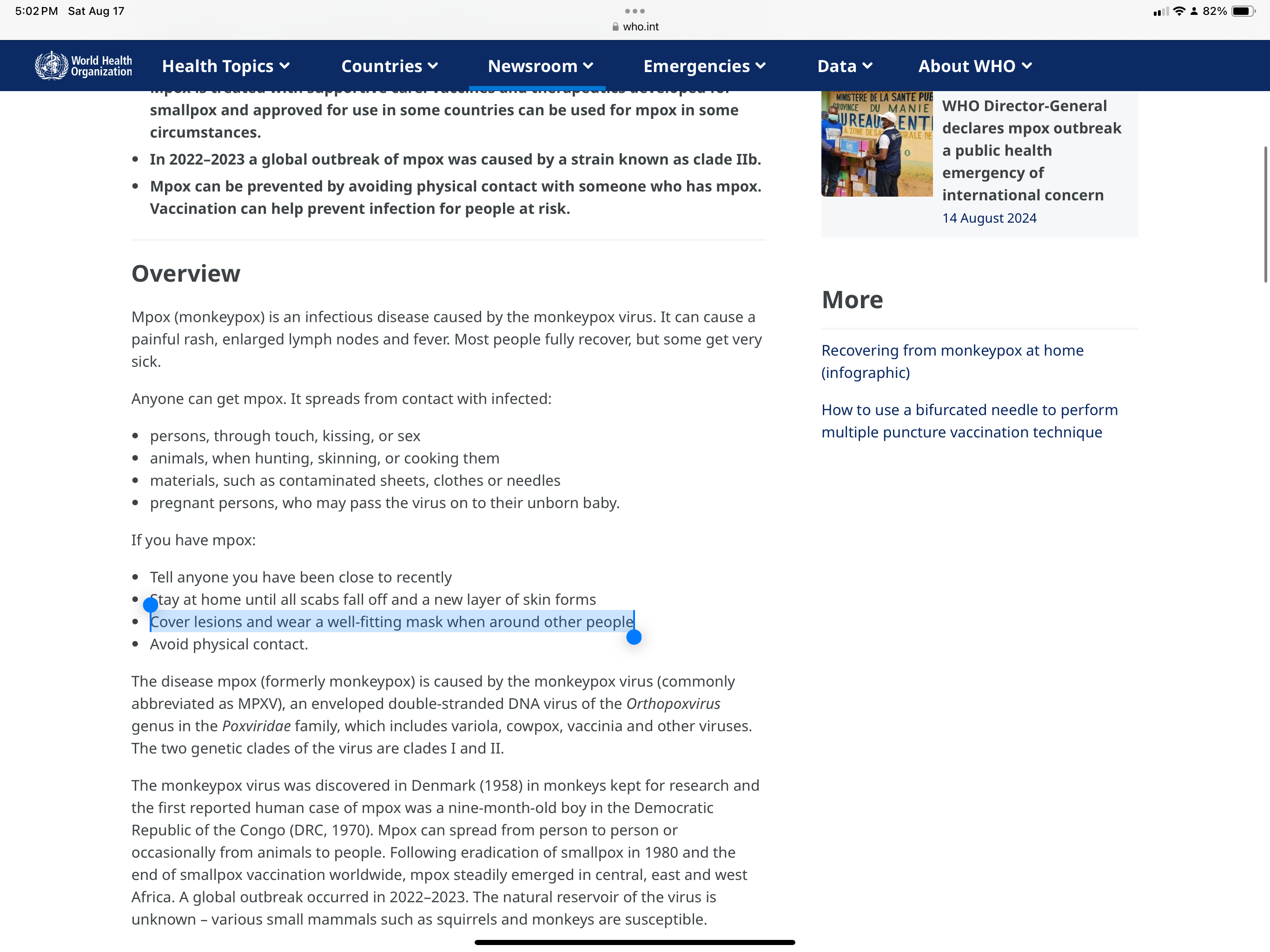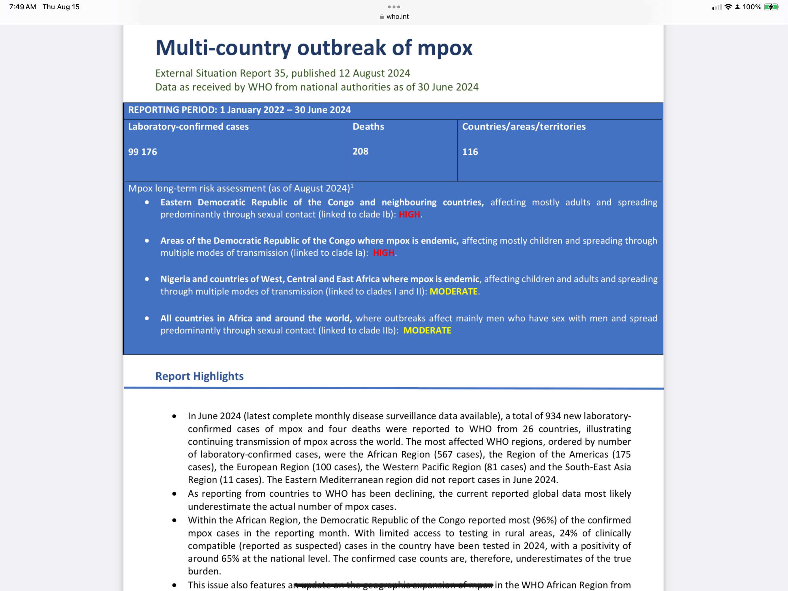 First, understand that monkey pox or mpox is still primarily only transmissible through skin to skin contact or contact with something that was in contact with an open sore (obviously sexual contact counts). I have not been able to find a single case of mpox that has been shown to have spread via the air or without contact. So if you have it stay home and don’t touch people but if you do not have sores or open wounds it really doesn’t matter. Further, there have only been a couple of hundred deaths globally since 2022 so it is frankly meaningless in terms of danger (unless they’ve released the no GoF version). Below is a pic from a WHO epidemiological report.