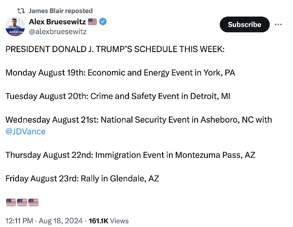 The slogans “Trump-Vance: ‘Weird as Hell,’” “Harris-Walz: Fighting for You,” and “Project 2025 HQ” are also in rotation.