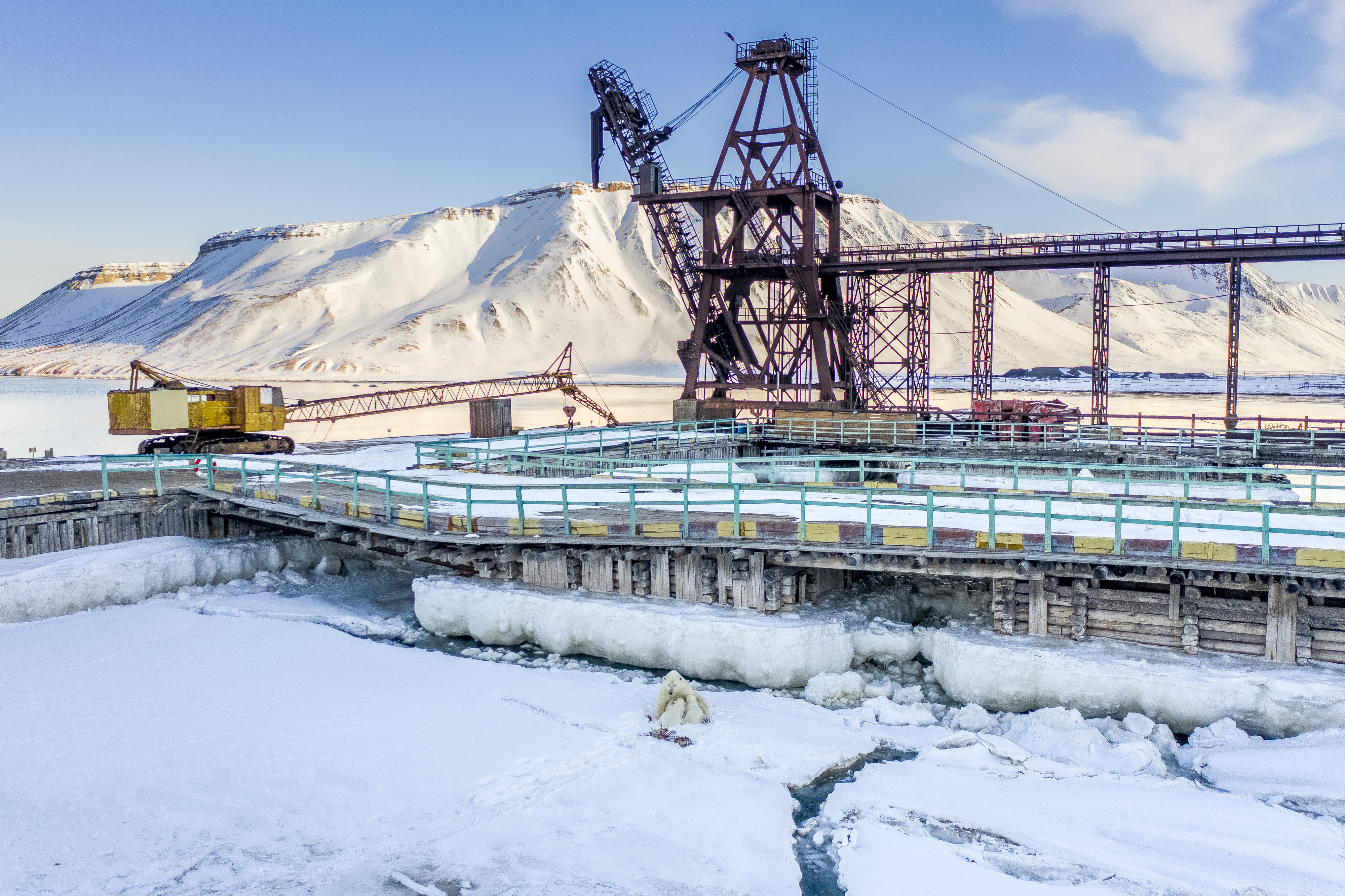 Breastfeeding in town A female polar bear breastfeeding her two cubs of the year in the harbour of the abandoned Russian settlement, Pyramiden. © Florian Ledoux/TNC Photo Contest