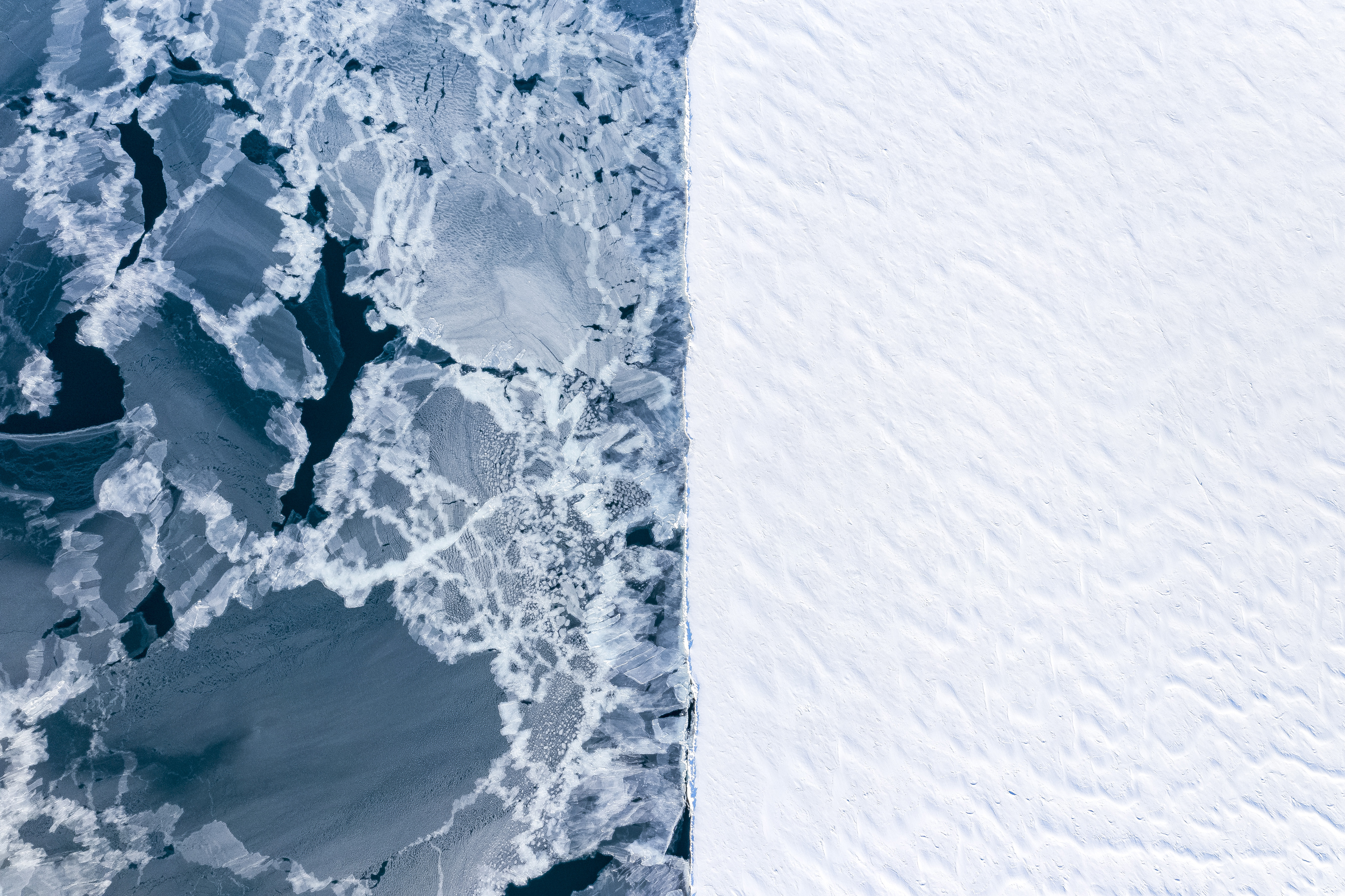 Two worlds Aerial view of two different types of ice in winter. On the right side, the well established fast ice. On the left, the open water refreezing after a storm took away the ice. © Florian Ledoux/TNC Photo Contest