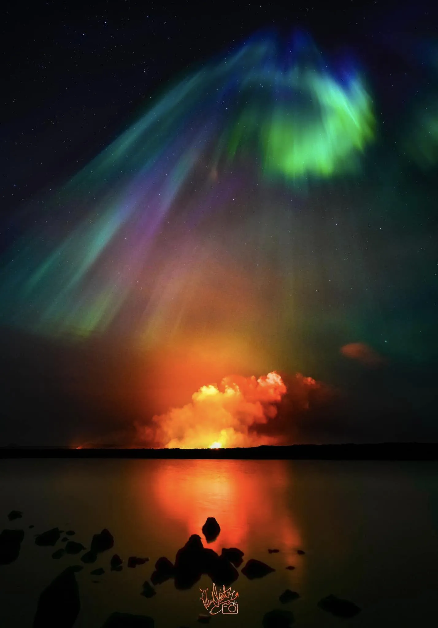 “Unreal… Aurora above eruption of Sundhnúkur crater, Vogar, Iceland…”