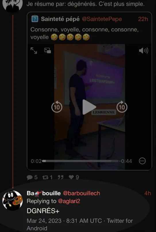 Barbouille’s post referred to people who engage in such indoctrination as “degenerates,” with a funny play on words in French “DGNRÉS+” and a direct hint to the famous French TV program “Des Chiffres et des Lettres,” which was referenced by the original poster with his “consonant, vowel,…” tweet.