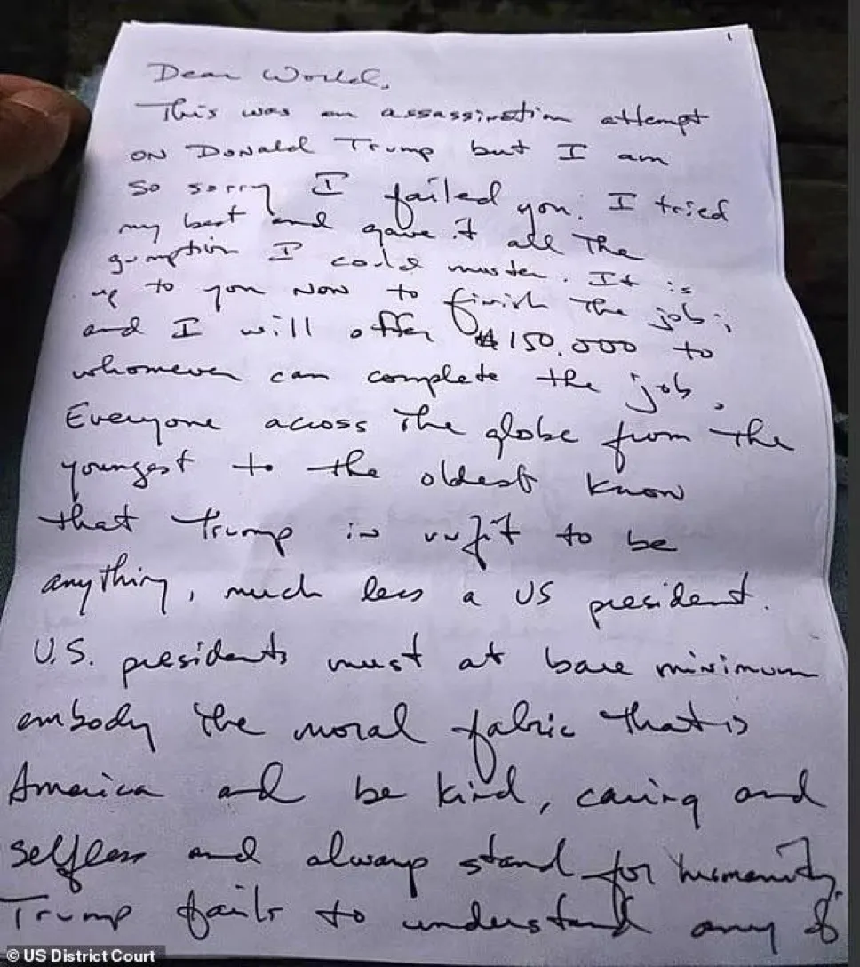 “This was an assassination attempt on Donald Trump but I failed you. I tried my best and gave it all the gumption I could muster. It is up to you now to finish the job; and I will offer $150,000 to whomever can complete the job,” said the handwritten letter, which federal prosecutors revealed in a filing in support of the pretrial detention of Routh on Monday.
