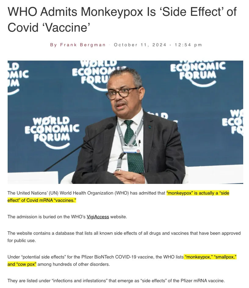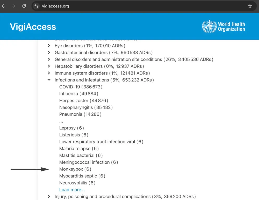 ENTIRE ARTICLE: “The United Nations’ (UN) World Health Organization (WHO) has admitted that “monkeypox” is actually a “side effect” of Covid mRNA “vaccines.” The admission is buried on the WHO’s VigiAccess website. The website contains a database that lists all known side effects of all drugs and vaccines that have been approved for public use.