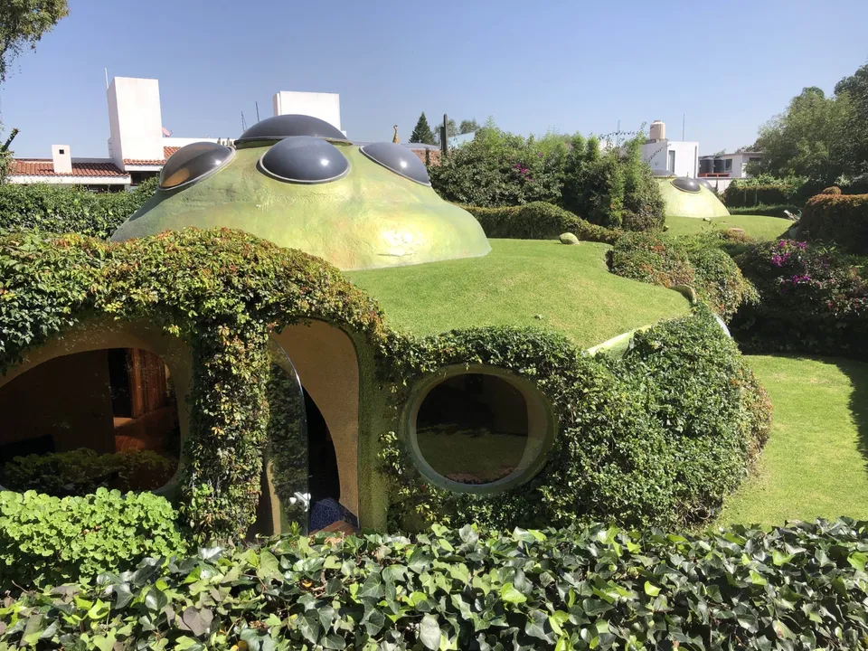 A pair of Senosiain’s “flower houses” show off their curves. The turf-covered buildings are equipped with rooftop sprinklers to keep their greenery alive. Photographer: David Dudley/Bloomberg