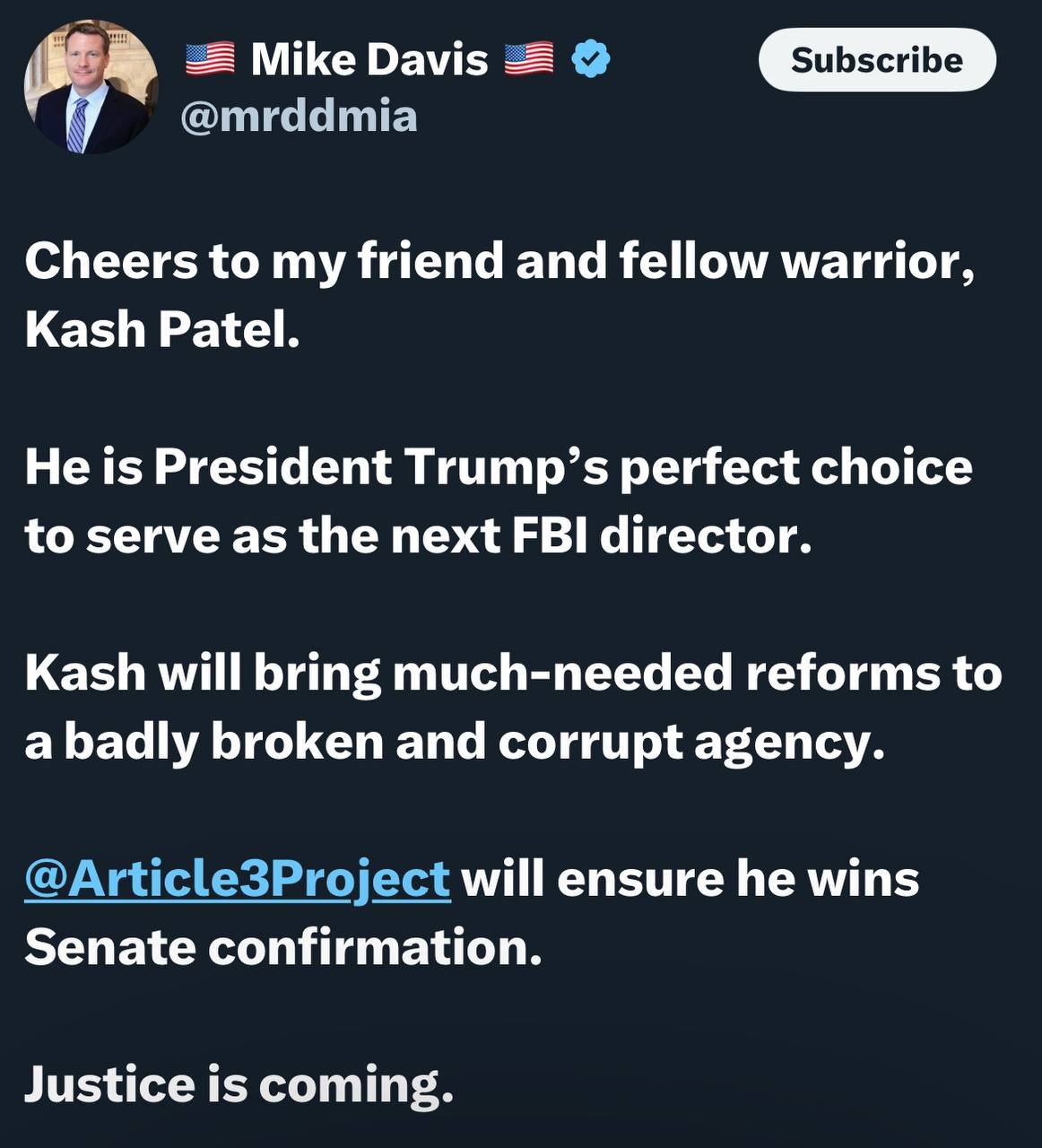 As for the threats to not confirm Patel, I’m not worried. Mike Davis, former Chief Counsel for the Senate Judiciary Committee, has damn near guaranteed it: