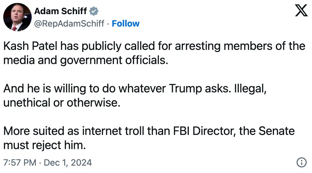https://www.breitbart.com/politics/2024/12/02/adam-schiff-demands-senate-reject-kash-patel-long-time-nemesis-as-fbi-director/